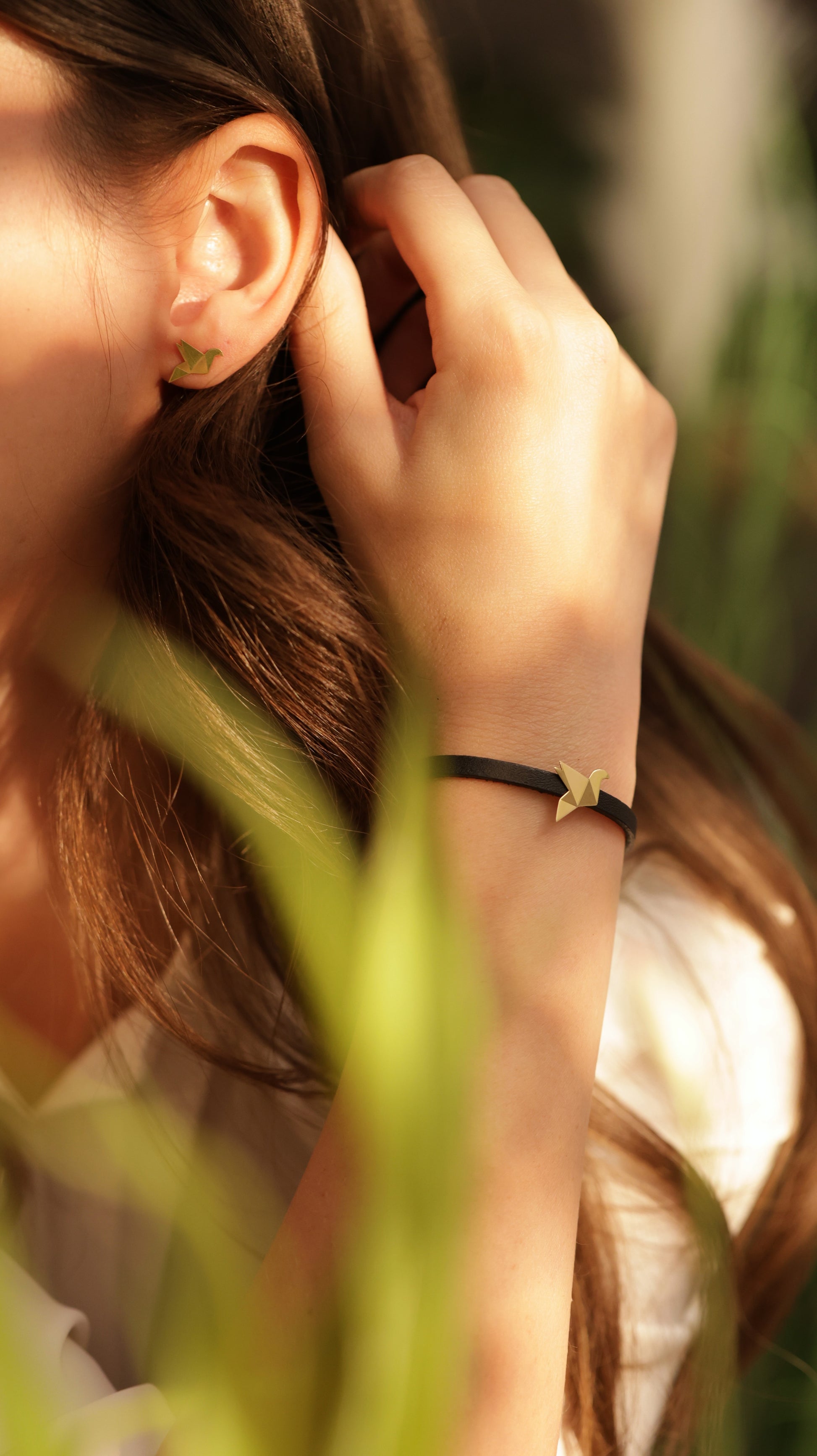 18kt gold Origami Bird earrings, symbolising joy, freedom and resilience.
